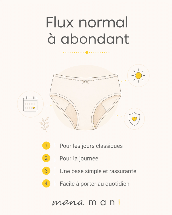 La culotte menstruelle flux normal à abondant est une bonne option si votre flux reste modéré à soutenu sur une grande partie du cycle, ou si vous cherchez une protection confortable pour la journée.
