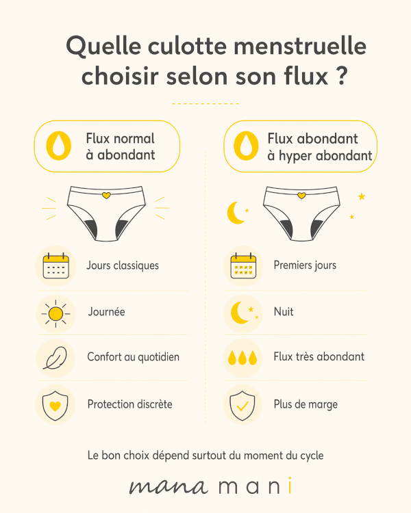 Une culotte menstruelle flux abondant à hyper abondant est souvent plus adaptée pour les jours intenses ou la nuit.